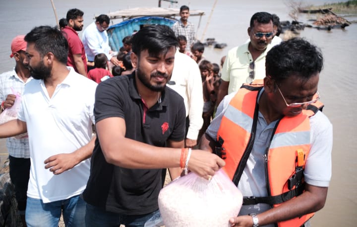 बाढ़ प्रभावित परिवारों के बीच जिला प्रशासन द्वारा किया गया राहत सामग्री का वितरण।