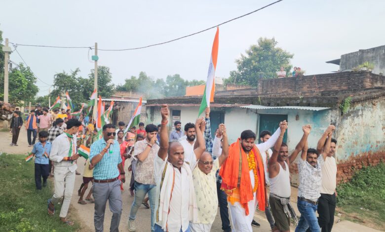 जमुई- स्वदेशी को बढ़ावा देने और तिरंगे के सम्मान का संदेश लिए नेचर विलेज के तत्वावधान में चल रही राष्ट्रगुणगान तिरंगा यात्रा शुक्रवार को अपने पाँचवें दिन भी जनसैलाब का केंद्र बनी रही। नेचर विलेज के संस्थापक निर्भय प्रताप सिंह के नेतृत्व में यह यात्रा जमुई जिले के विभिन्न गांवों में निकाली जा रही है, जहां हजारों की संख्या में ग्रामीण, महिलाएं और युवा उमड़कर इस