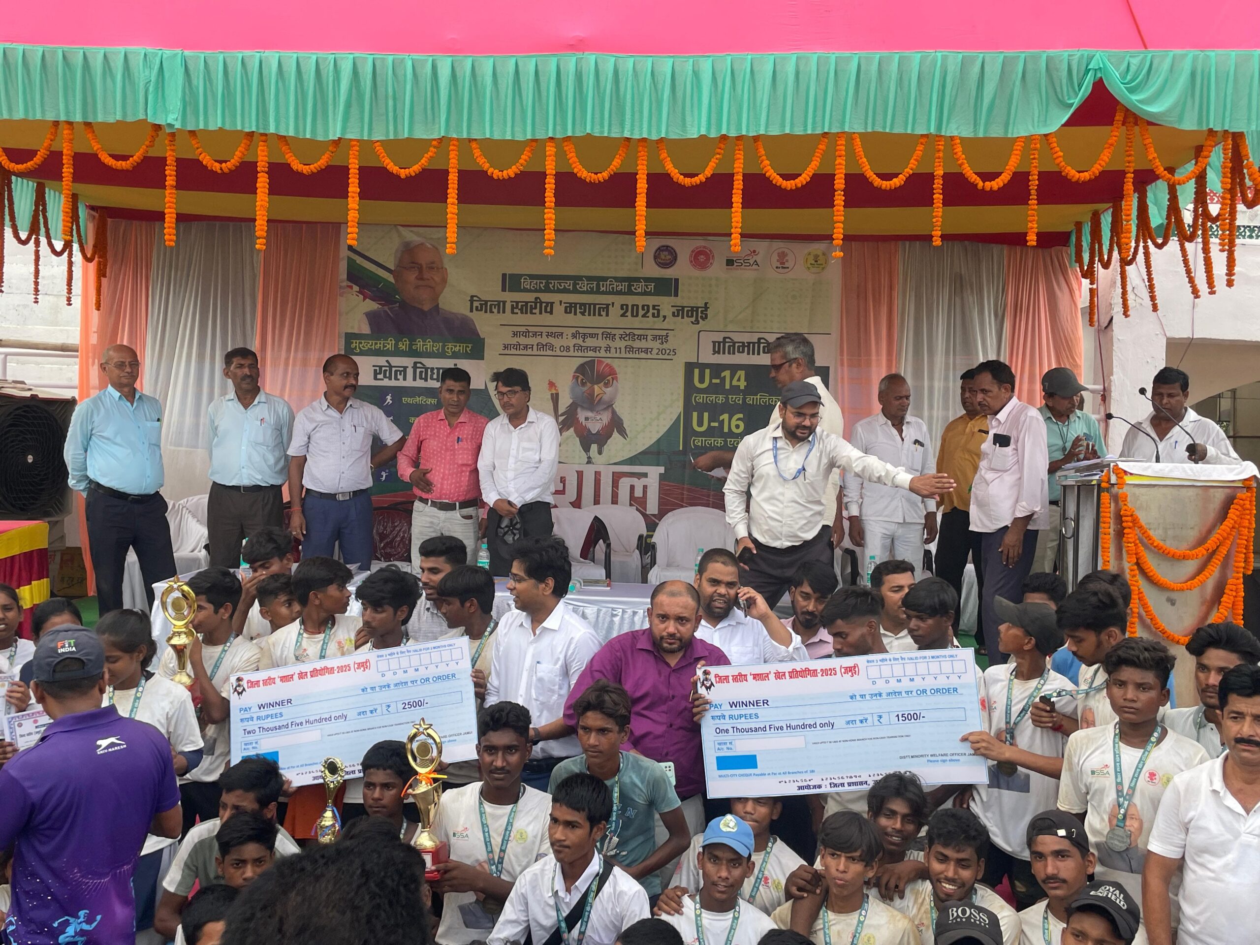 वहीं जिला पदाधिकारी महोदय जमुई ने युवाओं को संबोधित करते हुए कहा कि खेल मानसिक एवं शारीरिक स्वास्थ्य के लिए अति आवश्यक है एवं बिहार सरकार की अनेकों योजनाओं के तहत युवा खेल के लिए प्रशिक्षण ले रहे हैं तथा उन खिलाड़ियों को स्कूल टैग कर उन्हें अच्छी शिक्षा भी दी जा रही है।