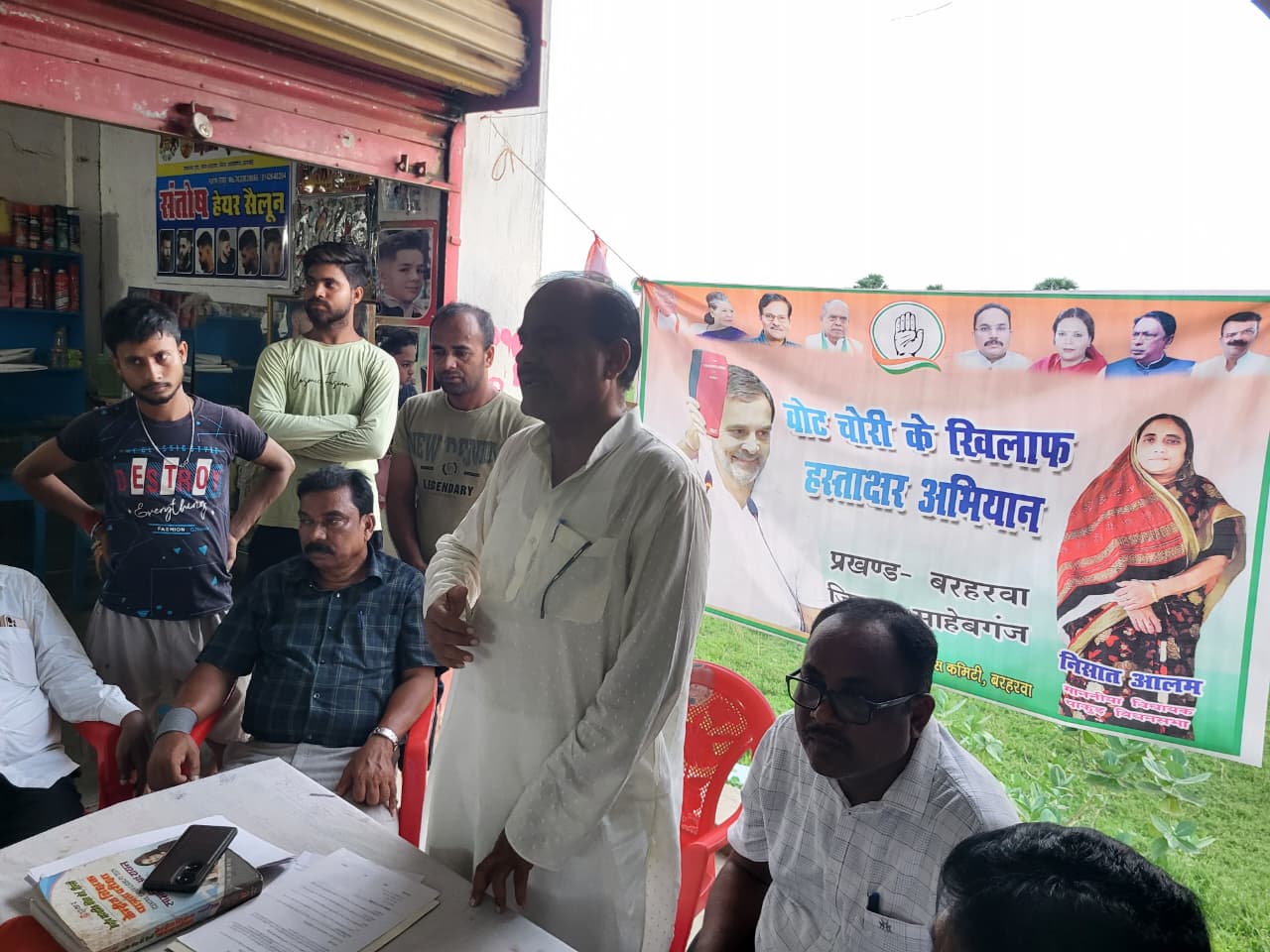 बरहरवा प्रखण्ड के रामनगर पंचायत में जिला अध्यक्ष सह विधायक प्रतिनिधि बरकत खान के नेतृत्व में कांग्रेस की ओर से “वोट चोरी रोकने” को लेकर एक हस्ताक्षर अभियान