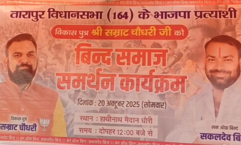 हमें और हमारे समाज को धोखा दिया। टिकट देने के नाम पर 3 से 4 करोड़ रुपये तक की मांग की जा रही थी। ऐसे लोगों से बिहार की जनता अब ठगी नहीं खाएगी।” सकलदेव बिंद ने कहा कि इस बार बिहार में भाजपा की सरकार बनाकर ही रहेंगे और जनता को “झूठे वादों” से मुक्त कराएंगे। सभा को संबोधित करते हुए डिप्टी सीएम सम्राट चौधरी ने कहा कि महागठबंधन की सरकार जनता के विश्वास के साथ धोखा कर रही है। उन्होंने कहा कि भाजपा एक बार फिर बिहार में विकास और स्थिरता की राजनीति लेकर आई है। सम्राट चौधरी ने कहा “हमारे समाज के लोग पहले से हमारे अपने हैं, वे कभी दूर नहीं हुए। भाजपा समाज के हर वर्ग के सम्मान और अधिकार की लड़ाई लड़ रही है।” सकलदेव बिंद के भाजपा में शामिल होने से मुकेश सहनी की पार्टी VIP में बेचैनी बढ़ गई है। सूत्रों के मुताबिक, पार्टी के कई स्थानीय नेता भी नाराज चल रहे हैं और वे आने वाले दिनों में अपना अगला राजनीतिक कदम तय कर सकते हैं। राजनीतिक जानकारों का कहना है कि VIP के लिए यह चुनावी सीज़न में बड़ा झटका साबित हो सकता हैं।सकलदेव बिंद के भाजपा में शामिल होने से तारापुर विधानसभा की सियासत में नया समीकरण बन गया है। स्थानीय स्तर पर अब भाजपा कार्यकर्ता इस घटना को “मिशन विस्तार” के रूप में देख रहे हैं, जबकि विपक्षी दलों में चिंता का माहौल है।