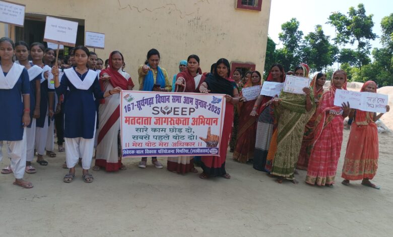 लखीसराय (सूर्यगढ़ा)- आगामी बिहार विधानसभा निर्वाचन को लेकर सूर्यगढ़ा विधानसभा क्षेत्र संख्या 167 अन्तर्गत पिपरिया प्रखंड के बूथ संख्या 31, मध्य विद्यालय पबई में शुक्रवार को मतदाता जागरूकता