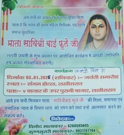 लखीसराय में माता सावित्रीबाई फुले की 195वीं जयंती 3 जनवरी को, संगम होटल में सुबह 10 बजे से होगा भव्य आयोजन।