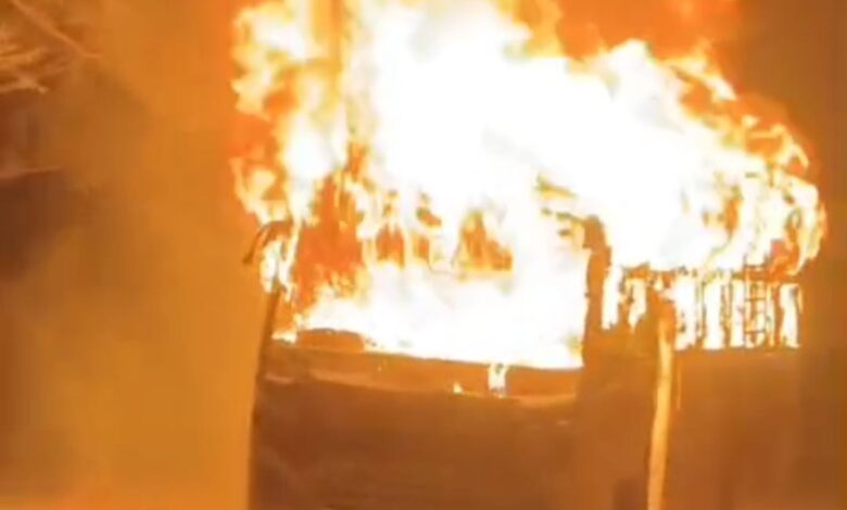 सड़क हादसे में युवक की मौत के बाद बवाल, आक्रोशित लोगों ने यात्री बस फूंकी।