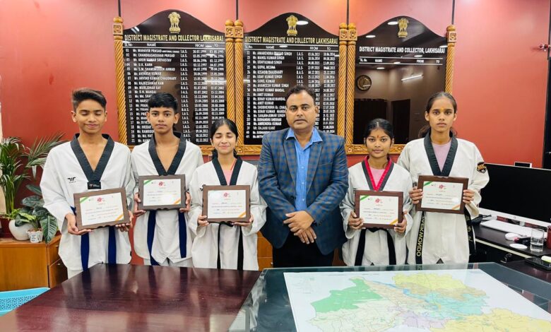 लखीसराय – जिला पदाधिकारी, लखीसराय श्री मिथिलेश मिश्र के कार्यालय कक्ष में एक विशेष सम्मान समारोह का आयोजन किया गया, जिसमें जिले के उत्कृष्ट ताइक्वांडो खिलाड़ियों को “बिहार खेल सम्मान” प्रदान किया गया। समारोह में खिलाड़ियों, प्रशिक्षकों तथा