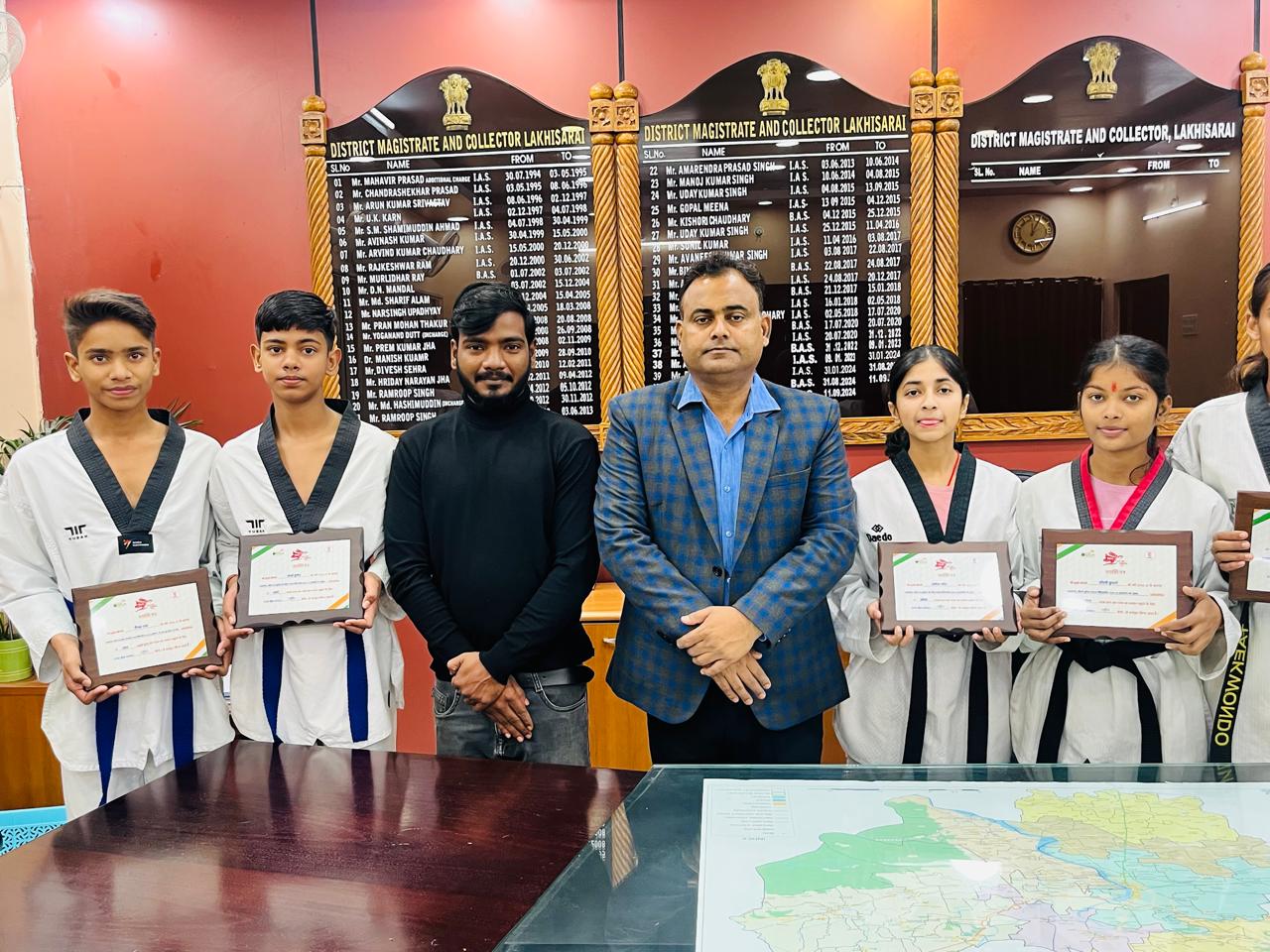 लखीसराय – जिला पदाधिकारी, लखीसराय श्री मिथिलेश मिश्र के कार्यालय कक्ष में एक विशेष सम्मान समारोह का आयोजन किया गया, जिसमें जिले के उत्कृष्ट ताइक्वांडो खिलाड़ियों को “बिहार खेल सम्मान” प्रदान किया गया। समारोह में खिलाड़ियों, प्रशिक्षकों तथा